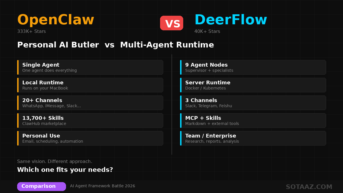 OpenClaw (333K stars) vs DeerFlow 2.0 (40K stars) comparison. Personal AI butler vs AI research team — architecture, channels, skills, and real benchmarks.